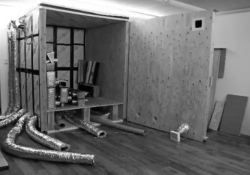当社事務所の倉庫を利用して実物大の部屋のモデルをつくり、チャンバーやダクト等の実験を重ねました。