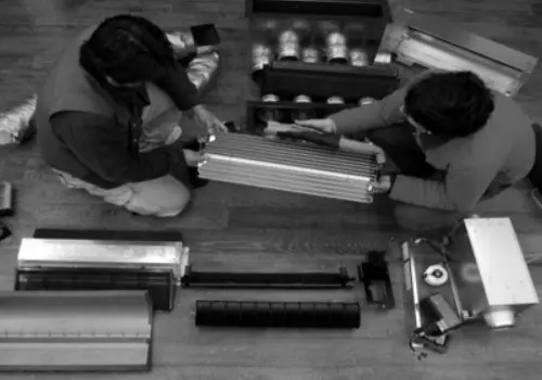 高効率のエアコンの仕組みを知るためエアコン本体を分解したり、組み立てしたりして仕組みを理解しました。